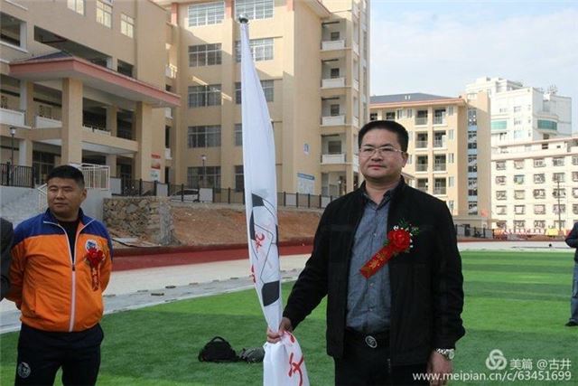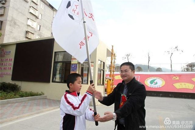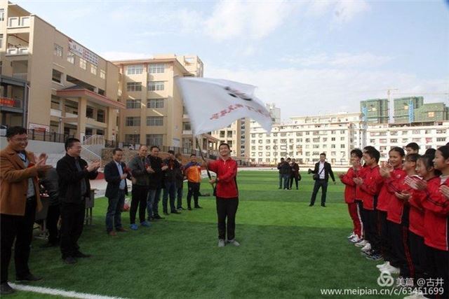 足协副主席、丁墘村主任李文芳给二中足球队授旗