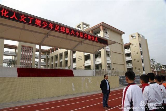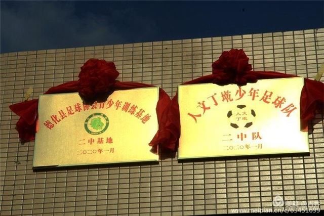 阳光下金光闪闪的二中训练基地和人文丁墘足球队牌子