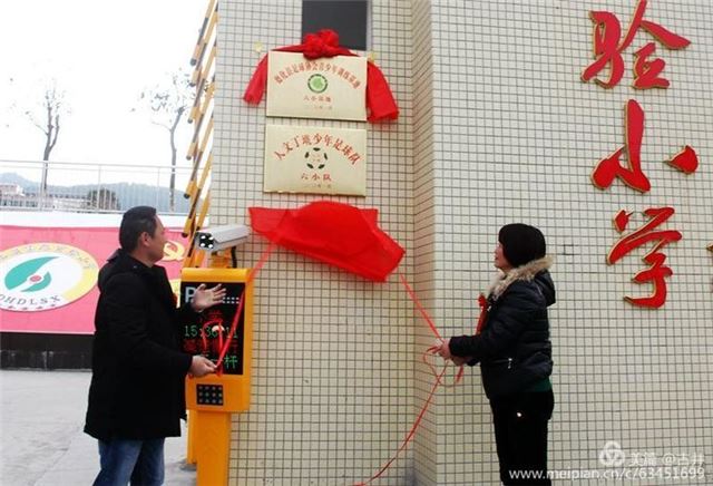 丁墘村党支部书记陈文能、教育局督学郑素琴为六实小足球训练基地和足球队揭牌