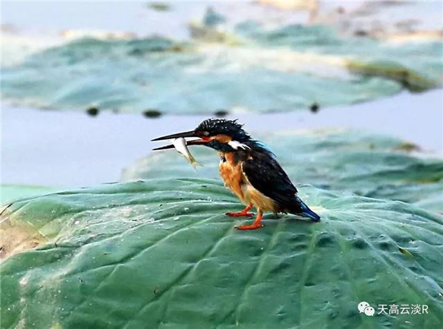 幼雉衔鱼浮碧叶,