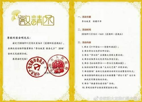 受中共安陆市委市政府、安陆市委宣传部之邀,《人民日报》、新华网、人民网、《湖北日报》、湖北电视台、《孝感日报》等新闻媒体记者和第三届“李白杯”散文诗歌大赛获奖人员、全国众多“诗仙李白”著名研究学者共同参加了本次2018金秋文化旅游活动开幕式和交流、论坛讲座活动。本次活动得到了安陆市委办、安陆市委宣传部、市文联、招商局、文体新局、安陆网信办、安陆市文联、安陆市电视台、各新闻媒体和各直属对口单位的大力支持。