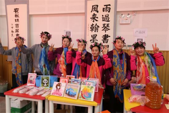 旧县镇温馨家园的学员在颁奖典礼现场展示他们的手工作品