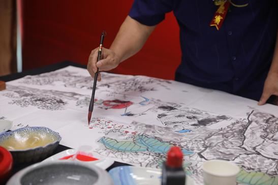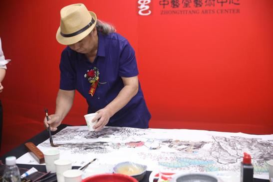 在签约仪式后,叶阿林老师亲自为大家现场作画,一边在宣纸上挥毫、点缀,一边介绍到:他画山水画,从来不用铅笔打草稿、勾线条,而是用心构思布局打腹稿,然后用毛笔堆砌而成。这些山石花草,不是描出来画出来,而是浓浓淡淡点击出来,层层叠叠堆砌出来,这也是师法自然感悟到的。自然不是平面的画,天空也不是平面的画布,自然界的山水万物都是层层叠叠堆砌互动分化而成的。这云雾远山,是用洗毛笔的水点缀的;这深幽的近山树影,也不是用浓墨重笔画出来,而是用时浓时淡的毛笔层层叠加起来的;即使这云影,也不是画出来的,而是周边的墨彩在宣纸上融渗而成。这些在实践中摸索出来的经验成为了叶阿林创作中国山水艺术的宝贵财富。