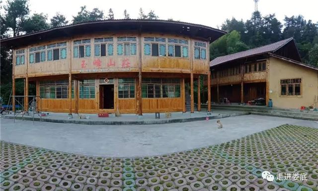 站在玉峰山庄的坪里,山对面连绵起伏的山峦尽收眼底,掏出手机一拍,美景立即入画来。夕阳西下的玉峰山庄,加上桐油涂饰后的效果,显得流金溢彩。真是“金黄的天、金黄的地,金黄的玉峰山庄更美丽!”