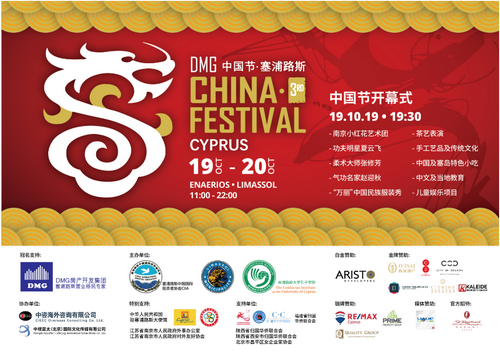 为庆祝中华人民共和国成立70周年,2019年DMG中国节·塞浦路斯系列活动,将于2019年10月17日~ 20日分别在塞浦路斯首都尼科西亚市和经济中心利马索尔市隆重举办。系列活动有塞中商务合作论坛、总统府慈善晚宴、第三届塞浦路斯中国节!