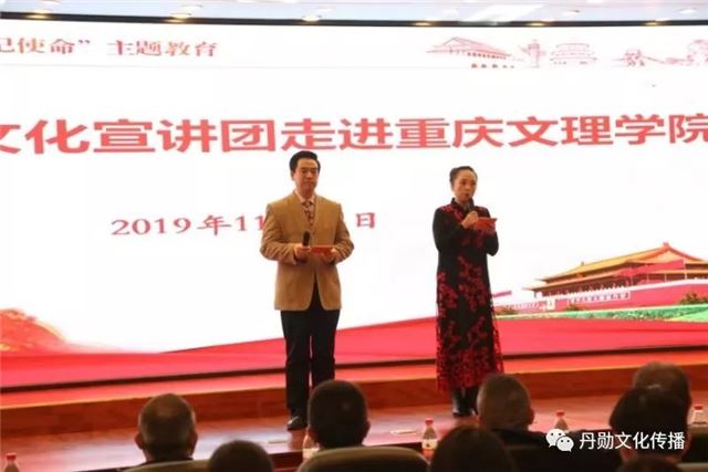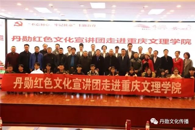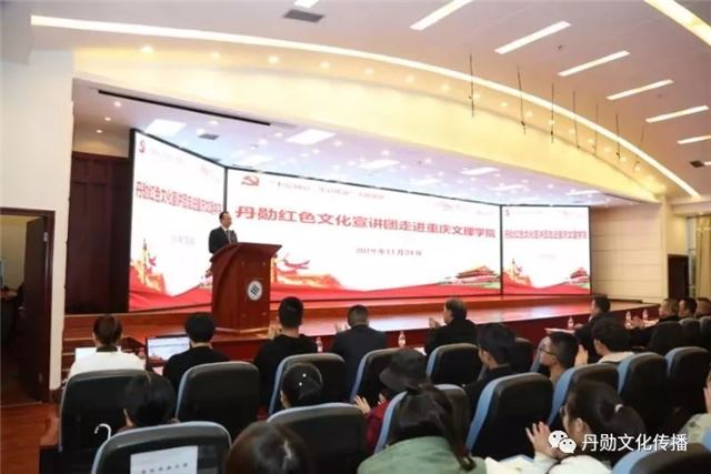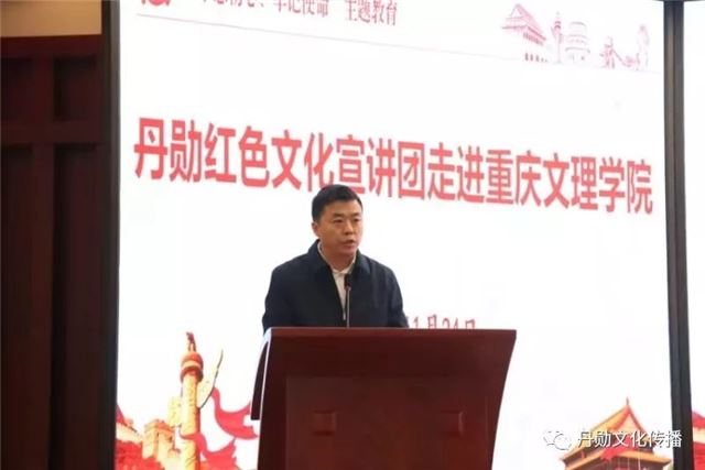 重庆文理学院党委常委、副校长金盛致辞,对丹勋红色文化宣讲团的到来表示热烈的欢迎。他指出,在全国上下深入开展“不忘初心、牢记使命”主题教育活动之际,我们邀请丹勋红色文化宣讲团来校开展红色文化宣讲具有重要的意义。他简要介绍了学校发展概况及近年来取得的突出成绩,说明了红色文化的内涵、价值和意义,希望师生细细品味红色文化的魅力,感悟老一辈革命家的家国情怀,坚定不忘初心、继续前行的理想信念。