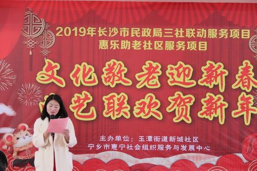 本次活动由宁乡市惠宁负责人罗晴主持,属于2019年长沙市民政局三社联动社区服务项目——“惠乐助老”社区服务项目的主题活动之一,以玉潭街道新城社区为依托,以文艺汇报的表演形式,给社区老年居民带来欢乐,展示社区三社联动服务模式建设成果,推进邻里和谐共生,推动社区建设和谐发展,与社区老年居民共度佳节。