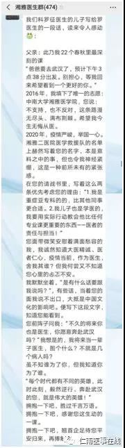 还有湘雅附二医院的那么一对父子,爸爸将要逆行,在临行前收到还在求医读书的孩子的一封信,信上说:“爸爸,知道您要前去武汉,这令我前所未有的紧张,但是您之前也问过我,不久的将来你也成了医生,你愿意做一个逆行者吗?我想,我会的,您不是正教着我吗?!.......拥抱一下吧,胜过千言万语,拥抱一下吧,感谢您这生动的一课”。我想这一对父子也给我们上了生动的一课,我在想我和我的儿子能否这么庄重这么感人这么有力量一次。这一对父子难道不可爱吗?