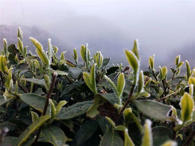 天门寒茶基地,危岩林立,高峰拢围,山中的节令会晚一些。当一轴渲染淋漓的“冰冻”,写意成春风的信手拈来,便俨然有了山水叠嶂、烟云流润的疏离画境与“嫩芽尽披玻璃甲”。可谓:方圆奇峰之美,尽收环抱之内;百里景区灵气,皆蕴净土之中。