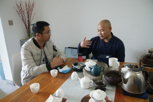 图:德化县龙门滩镇霞山村村委会主任郑家吉(左)向慧渡法师(右)介绍情况
