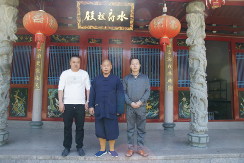 图:慧渡法师(左)考究水府庙旧址的石刻碑文