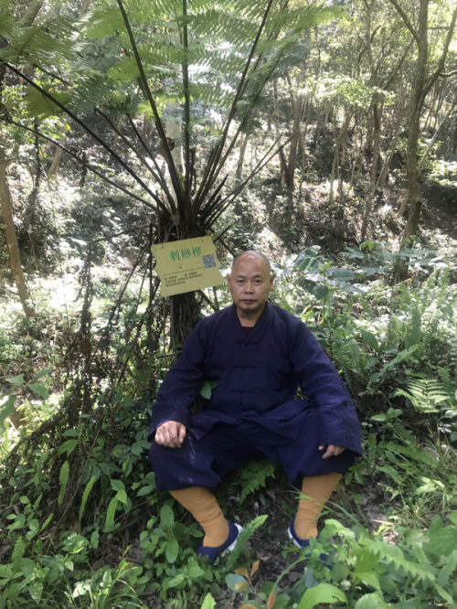 图:慧渡法师在桫椤树下感悟三亿年的时光流转
