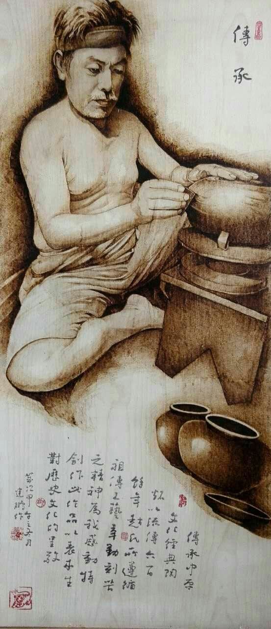 黄建鹏自幼师从四伯黄福正,学习传统工艺美术烙画及陶板画,是淡彩烙画第九代传承人,1981年考入中央工艺美术学院,跟随范曾、司徒兆光、钱绍武等老师学习绘画、雕塑等。黄建鹏视家族绝学如生命,刻苦钻研,通过对烙画源流的剖析和创新,终于攻克淡彩蜡染烙画技术难关,推动了淡彩蜡染烙画技艺迈上了新的台阶,最终成为享誉国内外的一代工艺美术大师。