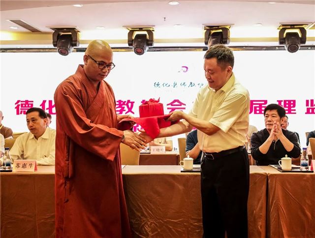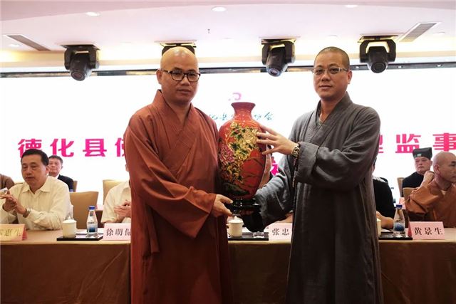 受省佛教协会委托,向愿法师代表省佛教协会致辞,佛心法师代表省佛教协会向德化县佛教协会赠送礼品。