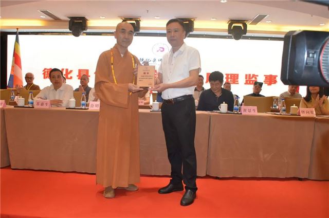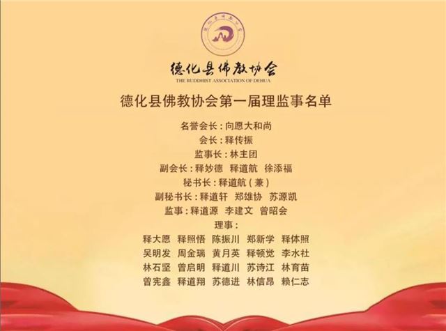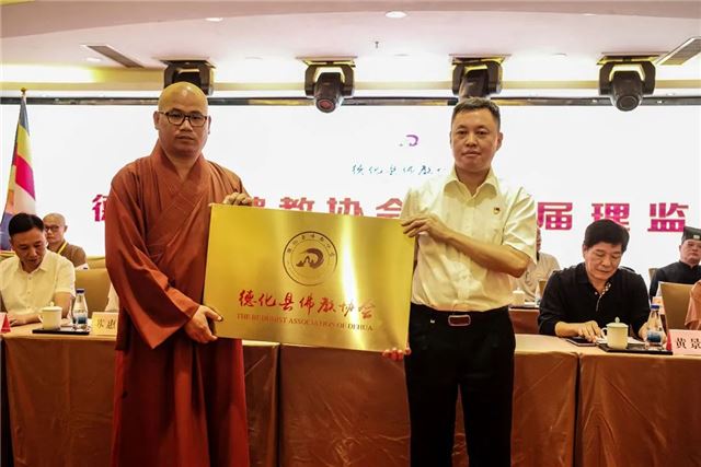 会上,德化县民政局副局长张玉树宣读同意成立德化县佛教协会的批复;德化县佛教协会第一届理事会会长传振法师领取印鉴、牌匾和证书,监事长林主团领取证书;聘请向愿法师为德化县佛教协会名誉会长。
