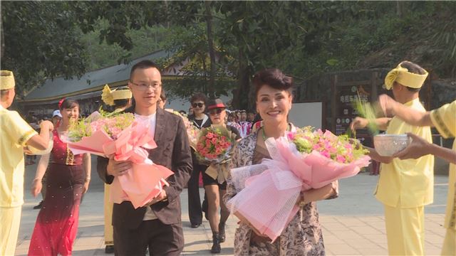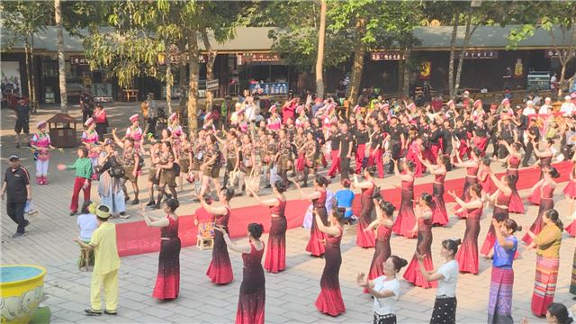 一大早,全国各地的代表们身着各具特色的盛装齐聚西双版纳国家森林公园的泼水广场,热情好客的西双版纳傣族人民穿上民族服饰,敲起象脚鼓,把象征着吉祥、幸福、健康的水洒向人群中,用热烈的仪式来迎接来自远方的客人。优美的歌声和欢快的舞姿,一幅幅民族风情场景感染着每一位远到而来的舞者,场面十分壮观。