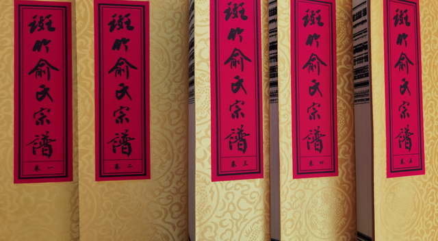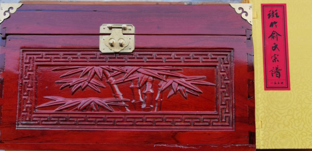 这次宗谱的百年重修,专门成立了以俞小国为主任,以俞国平、俞国永和俞诚方为副主任的重修《斑竹俞氏宗谱》委员会,向境内外所有的斑竹俞氏后裔征集信息资料。同时聘请五峰俞氏剡派后裔、宁波社科院原副院长俞建文和明派斑竹俞氏后裔、现在慈溪融媒体中心工作的著名诗人俞强作为顾问。本次重修《斑竹俞氏宗谱》历时一年有余,经六校而初始告竣,不可谓不慎重。这套宗谱封面黄色绸面,小圆龙底纹,黑字,金线装订。可谓装帧精美,集雍容华贵与儒雅于一体,还配上了量身定制的精致的樟木箱。箱面上雕刻着具有斑竹村地标意义的金井桥与竹子图案,令人双眸一亮。