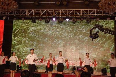 罗仁超和刘航军肯定和勉励这台节目的创作团队并与舒满平、夏梅子合影留念。(从左至右舒满平、刘航军、罗仁超、夏梅子)