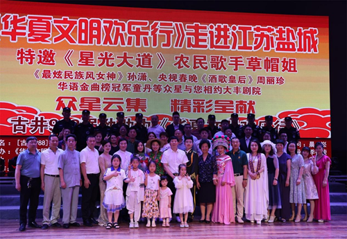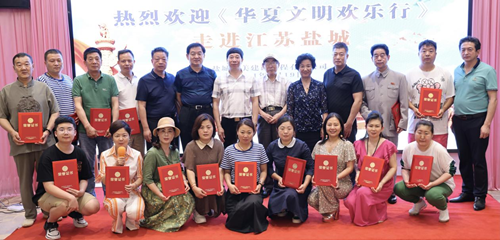 参加此次华夏文明欢乐行走进江苏盐城,演出人员和团体有:中央电视台著名农民歌手草帽姐,组委会总导演、著名音乐唱作人孙潇,央视小童星毕海浪,著名表演艺术家陈业树,曾登上央视春晚的少数民族著名歌手周丽珍,著名歌手、演员佟佳霖霖,著名华语流行歌手童丹,曾登上中央电视台《星光大道》舞台的知名歌手陈琛,著名节目主持人万欣瑩,蔡中臣以及盐城市大丰海棠旗袍艺术团。