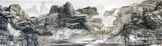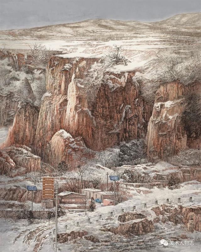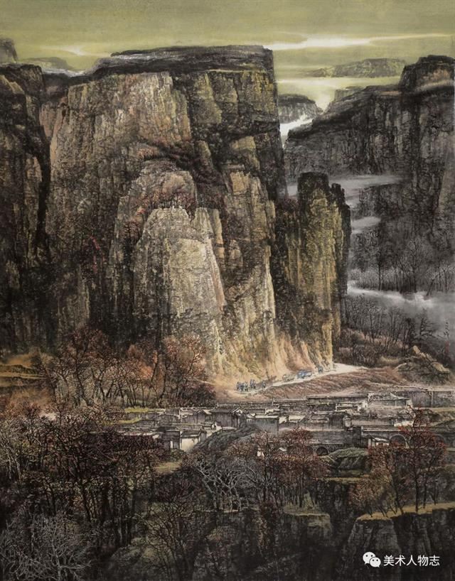 文成经常说,“我是在农村广阔天地的田边地头长大的,我的家乡就在茫茫太行山脚下……”文成骨子里对三千里太行有种冥冥之中的亲切感,家乡的那种浓浓的乡情、浓浓的味道,是他骨子里割舍不掉的依恋!文成从小看惯了雄浑厚朴的山岭,对它们有一种先入为主的亲切感和敬畏感。他只要有机会,就带着画笔、画夹,深入太行山写生、体验生活,挖掘眼睛对自然的真实感受,捕捉光影的瞬间印象。多少年来,在他的眼里,能拨动他心弦的不是南方的山清水秀,奇丽和缥缈,而是北方太行苍茫浑荒的崇山大岭,只因它的亲近有味、苍茫深宏。曹孟德“北上太行山,艰哉何巍巍”的豪吟,现代抗日英雄们“我们在太行山上”的战歌,还有现代人对天人合一哲学的再觉醒,无疑对他太行山作品的创作注入了定心的魂魄和撼人的力量。文成把太行本质的美,经过主观的思想感情的陶铸和艺术加工,创造出情景交融,蕴含著新意境的太行山水画来。