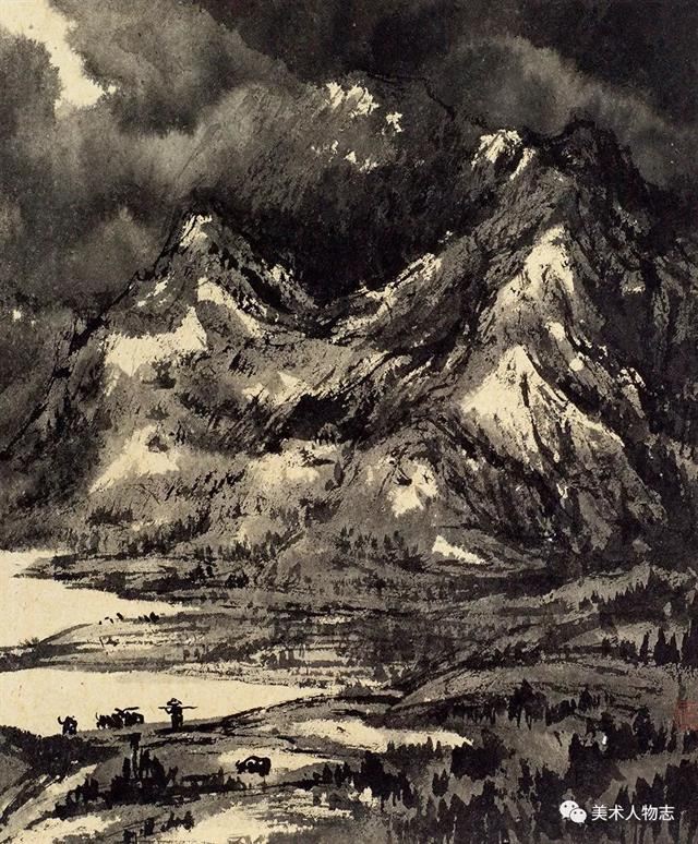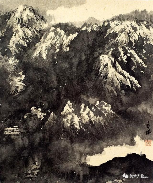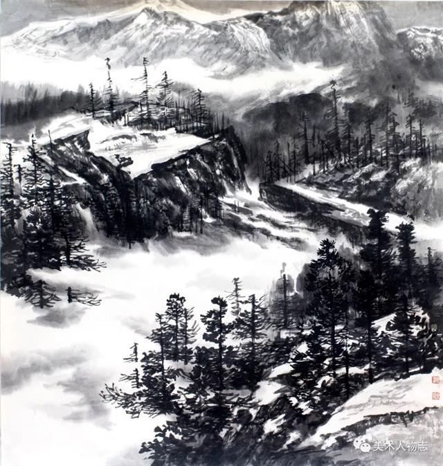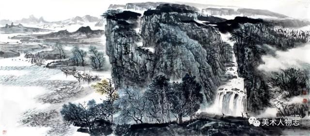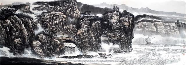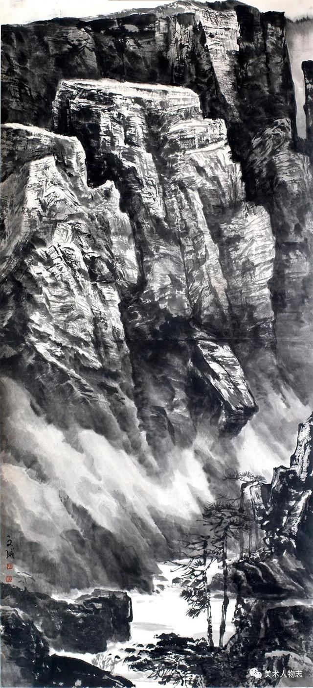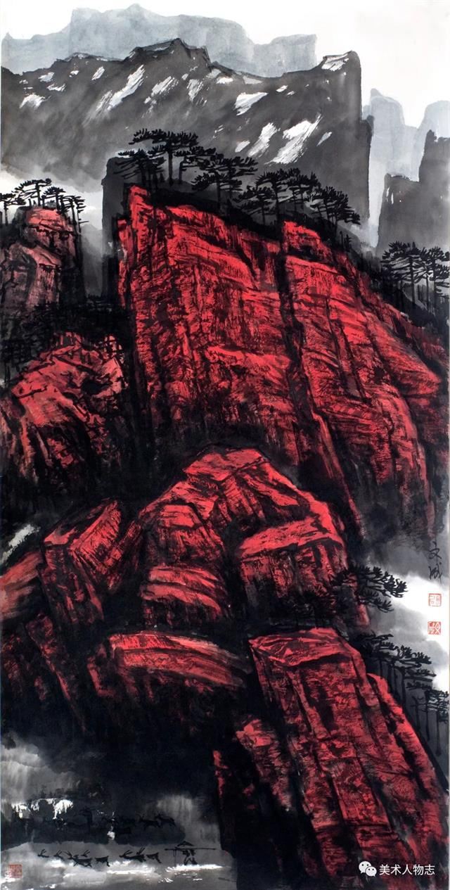 20世纪以来,溥心畬、陈少梅、祁井西、郭传璋等京津画派画家开始以北宗山水为师,形成有别于董其昌和四王传派的独特面貌,逐步流露出中国山水画的雄强气象。可能是先贤的垂范,也可能是前辈的感召。绘画科班出身却从事着警察职业的河北画家张文成的山水画也是以北宗为师,以北方山水为表现对象,这足足体现出了他的睿智。很多时候选择比努力更重要,绘画创作也是如此。张文成是北方人,自小生长在太行山周围,太行山的气脉一直在滋养着他。因此选择自己熟悉而亲近的太行山为表现对象,既是情感的依恋也是艺术创作取材上的明智。北宗山水的一个最重要的特征便是“斧劈皴”及其衍生出的放笔横扫的随意皴擦,这在张文成的山水画中都有所体现。他那或皴或擦的笔法,如秋风扫落叶般的气势不仅表现出了太行山的方结构,也有效地表现出了太行山的宏伟和高大。他在构图上更多地采用了“高远”的方法,突出了高山峻岭的雄壮,而缩小了点景人物的比重。他的用墨以积墨为主,破墨和泼墨互用,不拘小节,豪放大气。画者,心声也!这无不体现出了他的性格和情怀!虽然今后的路还很长,虽然张文成并不是一个音乐家,但孜孜以求、默默耕耘的张文成却像一个北方山水的歌者,而他的山水画更像是一曲北方山水的咏叹调!