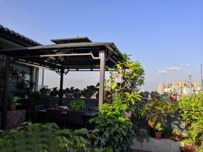 花园中,特意购置安装了一座亭台, 能遮风避雨,让我闲暇时看书、画画,或栽花种草。