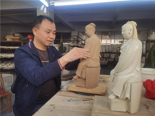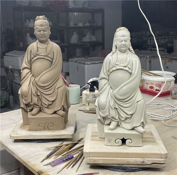 2020年9月,早已打下坚实技艺基础的郑雄伟终于决定敬摹明代“瓷圣”何朝宗关帝圣君像。他与福建省陶瓷艺术大师陈良瑜、福建省工艺美术名人郭爱珠一起组建了“合德堂”团队,秉承“德合天地,艺承古今”的理念,着手敬摹。他们首先深入查找关公的相关资料,了解人物的背景、特征、故事以及文化内涵,对关公的形象有了更准确和深刻的把握。因为有实物可观,他们对照原作,用心地观摩和研究每一个部位每一个细节,包括卧蚕眉形的角度,嘴角的弧度,衣纹的走向和线条数量,腹部高度,甚至头顶罩巾的结、耳廓的构造等等,全部都做到与何朝宗原作一致。
