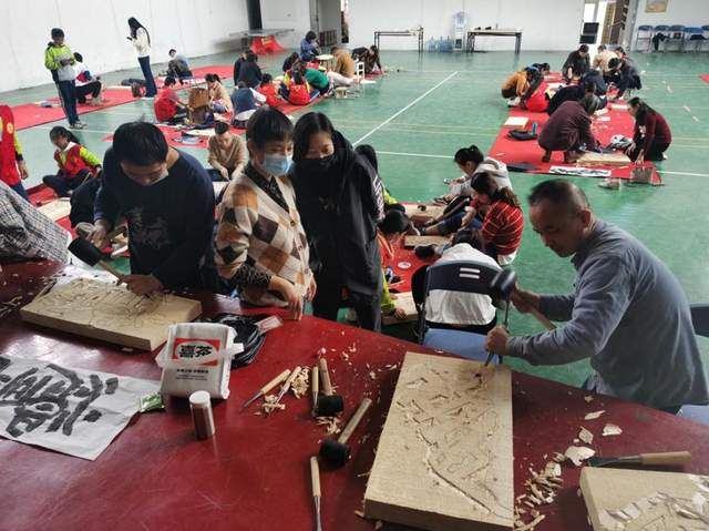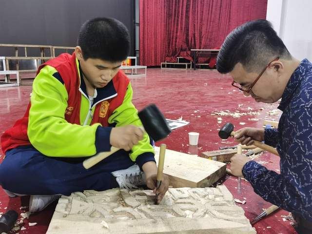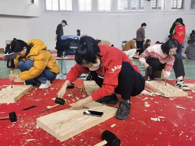 图:汉字书刻艺术研修班学员与泉州市凌霄中学书刻艺术实践工作坊学生在共同创作
