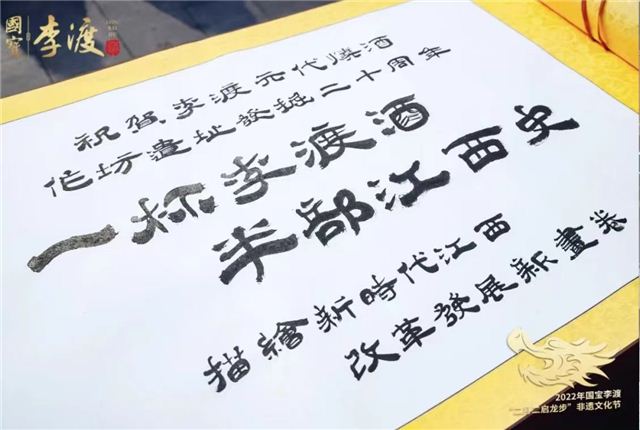 2002年,李渡元代烧酒作坊遗址考古发掘,解开了世界蒸馏酒的起源之谜。2022年,李渡元代烧酒作坊遗址迎来考古发掘20周年,李渡酒业邀请20位书画家莅临“二月二启龙步”非遗文化节现场,共同创作20米长卷《千里赣鄱酒卷图》,展现赣鄱大地好山好水酿好酒的宏伟风貌,以及李渡的文化内涵。