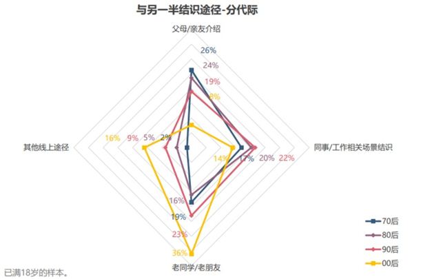《报告》显示,“70后”和“80后”主要是通过“父母/亲友介绍”结识另一半;而作为“互联网第一代”的“90后”和大多还在读书的“00后”则是通过“老同学/老朋友”和“其他线上途径”(注:包含游戏、微博、豆瓣、微信群、QQ群等)找到另一半的占比更高;除此之外,工作相关场景也是作为“职场打工人”的80后和90后结识伴侣的主要途径之一。不难看出:随着时代进步和互联网发展,“老同学/老朋友”渐渐替代了“父母/亲友”,同时“线上渠道”也越来越被接受和认可。