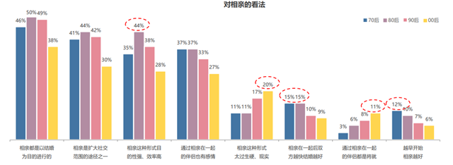 无论哪个代际的被访者,认为“相亲都是以结婚为目的进行的”占比均为最高;“70后”认为相亲要趁早、相亲成功也要尽快结婚;“80后”则是对相亲的目的性并不反感,而对其高效率表示赞同;“90后”相较而言对相亲更加抗拒,但同时也较为认可相亲的社交作用和目的性;而“00后”普遍认为相亲的形式太过生硬,从而对相亲表现出较大的抗拒。