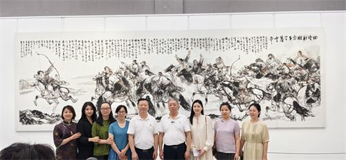 活动圆满落幕后,陈亚非先生依然精神矍铄。他不仅热情地为大家详细解说人物画的独特特征和精湛画技,还欣然接受了大家的邀请,在那幅长达8米、高达2米的人物画巨作前与大家合影留念。众人簇拥着陈先生,欢声笑语中,相机定格下了这难忘的一刻。七旬的陈亚非笑容满面,站在他的画作前,仿佛与画作中的每一个笔触、每一抹色彩都产生了共鸣。阳光透过展厅的窗户,洒在他的脸上,也映照在那幅栩栩如生的人物画上,为整个场景增添了一抹温暖而神秘的光彩。他的眼中闪烁着对艺术的热爱与执着,这份情感如同磁场一般,吸引着在场的每一个人。