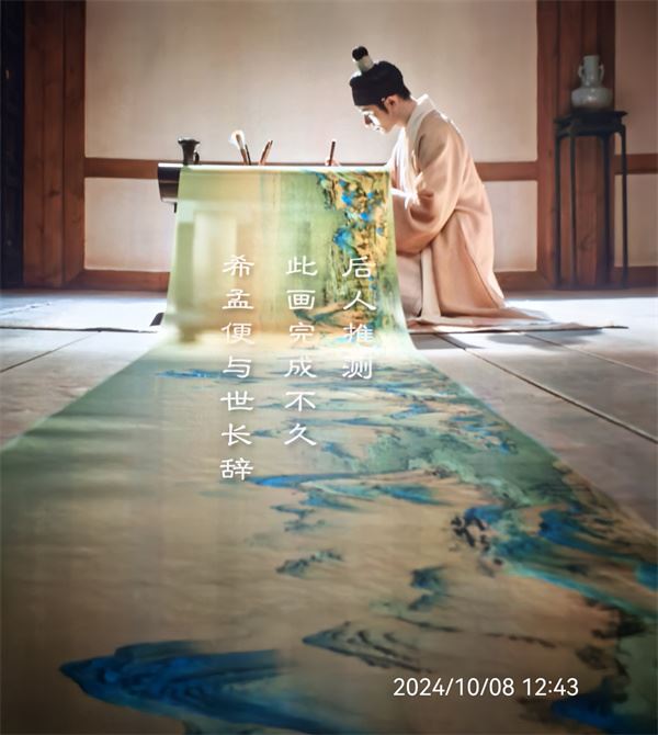 时光回溯至2021年,在北京中戏那充满艺术气息的校园里,洪紫千,这位才华横溢、青春洋溢的学生兼央视观察员,以一袭仿宋风格的《只此青绿》长裙,轻盈地融入《千里江山图》那壮丽而神秘的画卷之中,拍摄了一组古典韵味悠长、如梦如幻的照片。她将这些穿越时空、凝聚着深情与才情的影像珍藏起来,作为一份珍贵的礼物,寄给远在宁波的父亲洪斌。尤为动人的是,洪紫千在《海岛民宿·独享晴雨》的开篇之语——“人生若画,当如《千里江山图》,峰峦起伏,留白含韵”,这短短数语,如同一股清泉般滋润了洪斌那干涸的心田,激发了他对这幅名画无尽的遐想与探索之欲。