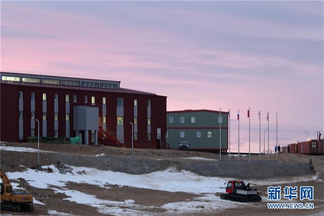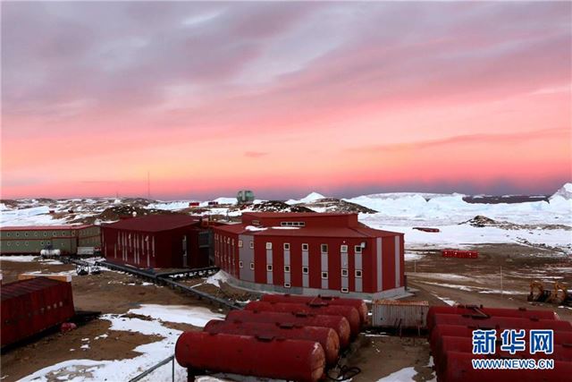 中山站的红色综合楼和绿色度夏楼(2月13日摄)。新华社记者刘诗平摄