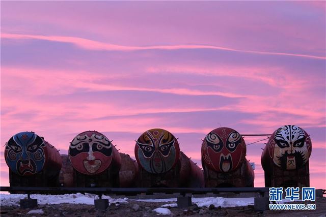 中山站绘有京剧脸谱的老油罐(2月13日摄)。新华社记者刘诗平摄