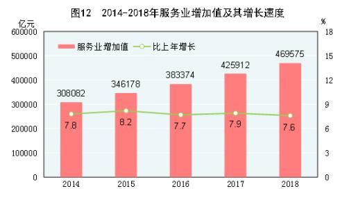 公报显示,2018年全年批发和零售业增加值84201亿元,比上年增长6.2%;交通运输、仓储和邮政业增加值40550亿元,增长8.1%;住宿和餐饮业增加值16023亿元,增长6.5%;金融业增加值69100亿元,增长4.4%;房地产业增加值59846亿元,增长3.8%;信息传输、软件和信息技术服务业增加值32431亿元,增长30.7%;租赁和商务服务业增加值24427亿元,增长8.9%。全年规模以上服务业企业营业收入比上年增长11.4%,营业利润增长6.5%。