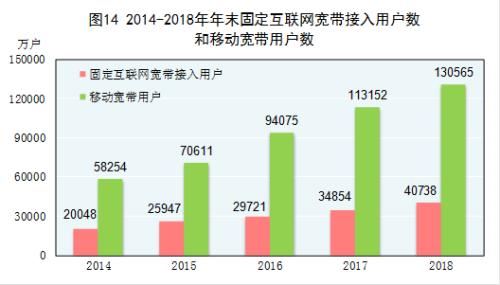 同时,2018年全年完成邮政行业业务总量12345亿元,比上年增长26.4%。邮政业全年完成邮政函件业务26.8亿件,包裹业务0.2亿件,快递业务量507.1亿件,快递业务收入6038亿元。全年完成电信业务总量65556亿元,比上年增长137.9%。电信业新增移动电话交换机容量17267万户,达到259453万户。年末全国电话用户总数174835万户,其中移动电话用户156610万户。移动电话普及率上升至112.2部/百人。固定互联网宽带接入用户40738万户,比上年末增加5884万户,其中固定互联网光纤宽带接入用户36833万户,增加7440万户;移动宽带用户130565万户,增加17413万户。全年移动互联网用户接入流量711亿GB,比上年增长189.1%。全年软件和信息技术服务业完成软件业务收入63061亿元,按可比口径计算,比上年增长14.2%。