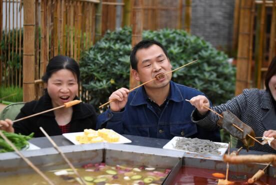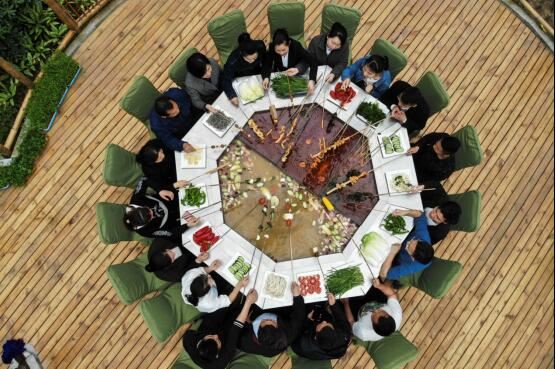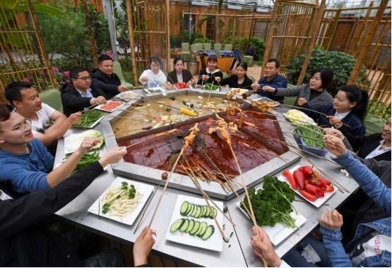 4月29日,湖南益阳现代农业嘉年华的农人们围在一个直径3米、自制巨型麻辣烫锅前分享美食,农人把温室内培育出的蔬菜纷纷倒入锅内,做成当地特色美食,用享受自己劳动成果的方式欢庆“五一”劳动节。