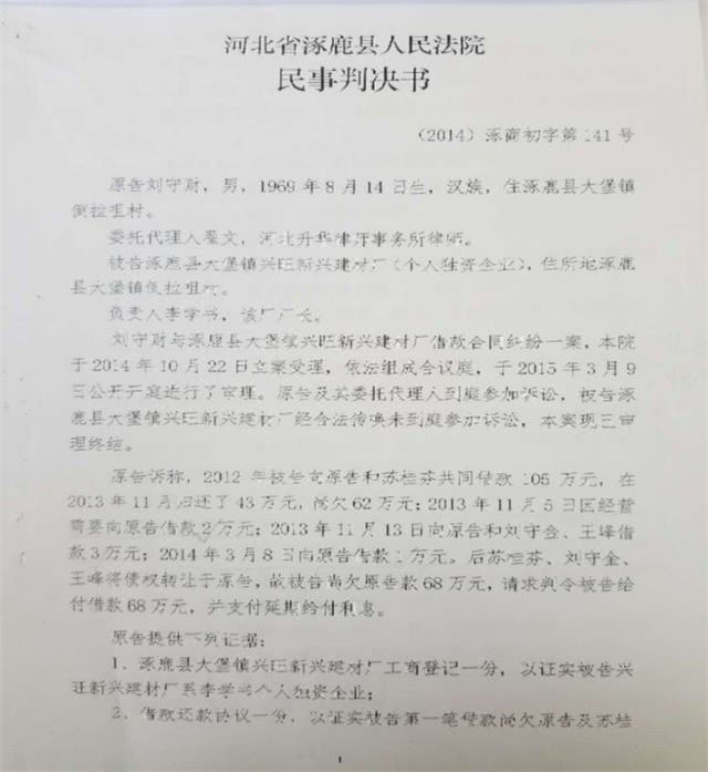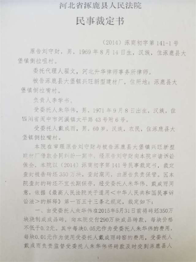 近日,河北省张家口市涿鹿县到啦嘴村村民刘守财,身份证号:132530196908143612。反映称,2014年10月8日,刘守财因与兴旺建材厂借款合同纠纷案向涿鹿县人民法院申请诉前保全,同日法院作出(2014)涿商初字第141号民事裁定书,对砖厂的350万块砖坯及砖厂机械设备进行保全。刘守财于2014年10月22日向涿鹿县人民法院提起诉讼,涿鹿县人民法院于2015年3月10日作出(2014)涿商初字第141民事判决书,判决兴旺建材厂给付申诉人欠款62万元及逾期还款利息。