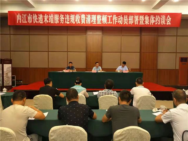 为纠正违法行为、规范市场秩序、维护用户权益,2019年8月14日,内江市邮政管理局召开全市快递末端服务违规收费清理整顿工作动员部署会暨对所有快递企业违规收费进行集体约谈,内江市邮政管理局和市消费者协会负责人出席。