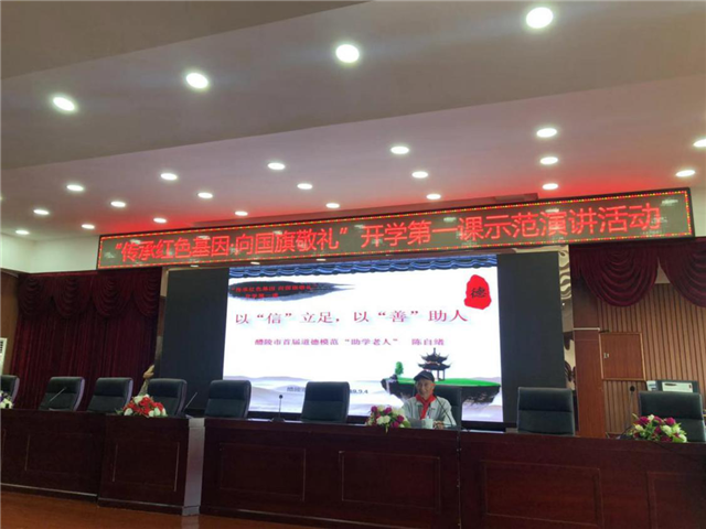 9月4日上午,由醴陵市委宣传部、醴陵市文明办组织,在全国文明校园——醴陵市姜湾(左权红军)小学多功能报告厅内举行了一场别开生面的、醴陵市道德模范为孩子们主讲的“传承红色基因,向国旗敬礼”开学第一课,该校300余名师生参与了活动。