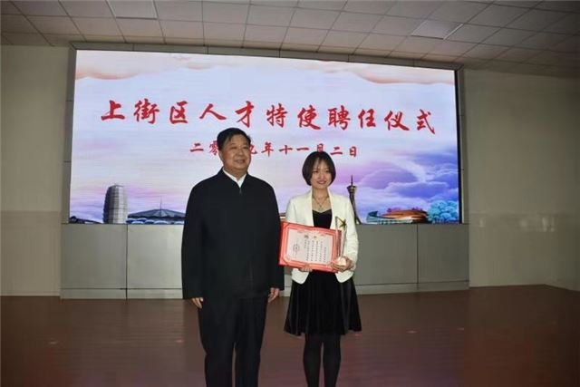 区政府领导李杰致辞,区委常委、组织部长赵晨阳为万蕊雪颁发“上街区人才特使”聘书。