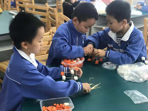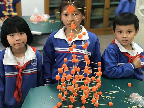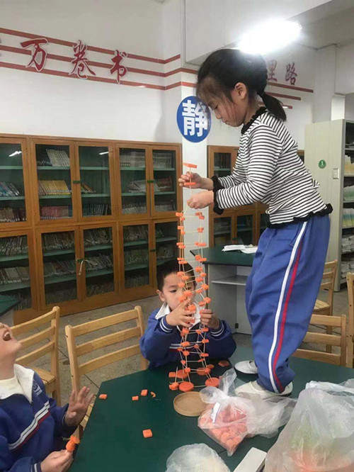 记者在现场注意到,为了让牙签和萝卜或土豆搭建的高塔够稳、够高、够有创意,有的学生参考摩天大楼,塔尖高耸;有的学生们想出了千奇百怪的搭法,例如:DNA双螺旋、棉花糖、双子塔、太阳能智能洋房……不同的切割方式,不同的搭塔造型。组装,搭高,保持稳定,一个步骤接一个步骤,有条不紊。而在赛前,各班参赛选手还在家或班级尝试多次,做好了充分的准备。赛场上,小选手们配合默契、有条不紊;时间一分一秒的过去,一件一件作品也逐渐呈现。尤其是比高,各班的选手们更是你拼我赶,想尽各种办法,哪怕比对手高一厘米,还有些学生的身高不够高,就站到桌子上继续搭。有的小组塔身基础不稳,倾斜倒塌,只好从头再搭,但他们没有放弃。