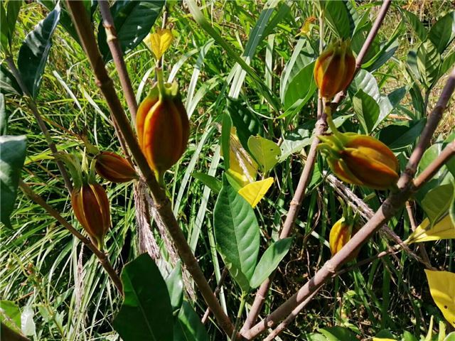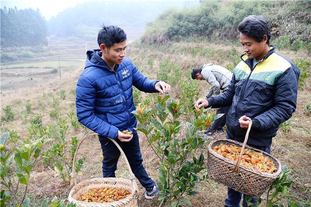 黄栀子又名山栀子,作为天然色素栀子黄的原料和传统中药材,广泛用于天然色素提炼、酿酒、食品、医药等领域。当说到黄栀子的药性时,邹曙文如数家珍。黄栀子是一种经济价值高、用途广泛的药食兼用植物。当地温润的亚热带气候,十分适合黄栀子生长,果实含天然色素较高,具有一定的优势。“黄栀子易种植、易管理,成本低、收益高,市场前景好。平时只要除草施肥就可以。种下去一年后就会结果,有近10年的丰产期,是真正的‘绿色银行’。”基地合伙人罗孝东介绍说。