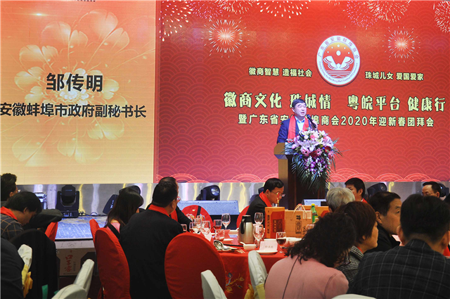 广东省安徽蚌埠商会2019年新春团拜会在广州隆重举办,广东省委办公厅原副主任张光发,交通厅原纪检委书记王志荣,徐承栋将军,张逢堂将军,原广东省民政厅广党组成员、巡视员高党生,原广州军区卫生部长江建荣,原黄埔区人大党组书记、常务副主任广州市政府教育督学顾问主任章登明,原司法局巡视员刘鸣高,中国航油华南公司巡视员岳峰,原广东地税局督察局局长张弟,原广州军区总医院首长保健专家张松权,中青旅文化旅游研究院(广州)有限公司执行总裁朱逸等在粤领导,蚌埠市政府副秘书长邹传明,蚌埠市招商和对外合作中心副主任王振宇,蚌埠市驻广州办事处副主任蒋运田,蚌埠市科协主席张建文,怀远县政协副主席朱玉龙,五河县政协副主席张茂飞,龙子湖区委常委副区长胡扣住,固镇县经济开发区党工委书记兼管委会主任张公民,淮上区人民政府人大常委副主任孙凤鸿,蚌埠高新区总经济师董磊,蚌埠经济开发区管委会副主任赵毅梅,原蚌埠市五河县政协副主席邓衍新等蚌埠三县六区领导嘉宾,广东省安徽蚌埠商会名誉会长倪士会、轮值会长朱世明、执行会长兼秘书长李振清、执行会长周洪元、监事长顾庆书、党支部(筹)书记崔健利等商会新一界领导班子,以及安徽相关兄弟商会、蚌埠商会广东21地市会员企业、乡友企业、媒体等约600多人参加了本次会议,大家欢聚一堂,共襄盛宴,共同分享美好时光。