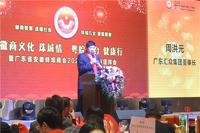 会上,广东省安徽蚌埠商会2020年执行会长周洪元发表讲话,他对参加本次年会的各位领导嘉宾及乡友企业等表示衷心的感谢及美好的祝愿,他提出,广东是粤港澳大湾区中十分重要的组成部分,迎来了巨大发展机遇,加上蚌埠市纳入长三角一体化的战略定位,对蚌粤两地的项目合作、人才交流以及经济发展将创造新的商机,而蚌埠商会将发挥着更大作用,成为推动会员企业项目对接、促进家乡经济发展的重要推力。希望蚌埠市委市政府领导一如既往支持蚌埠商会的发展,更希望在座来自广东21地市的乡友企业积极加入蚌埠商会这个大家庭,大家同饮淮河水,辗转南粤地,身处他乡,要感恩回馈、抱团取暖、互帮互助、资源共享、合作共赢。