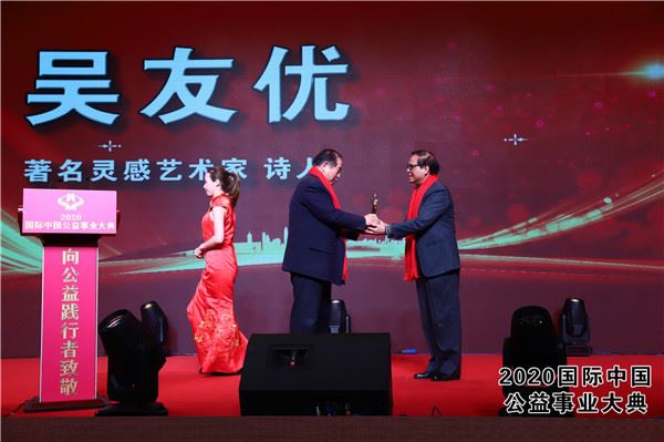 “灵感书法”创始人,著名灵感书法家、诗人吴友优荣获“2019年度国际中国艺坛领军人物”荣誉称号,并上台发表获奖感言。