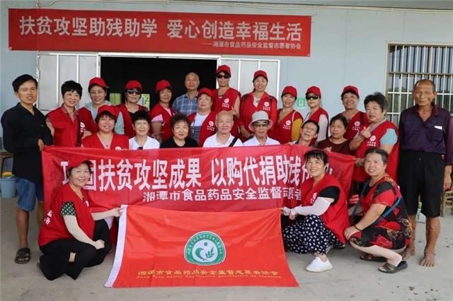 前往参加“以购代捐”助残扶贫的爱心人士是湘潭市食品药品安全监督志愿者协会30多位志愿者、协会顾问团的老领导、专家和湘潭民进会员等。