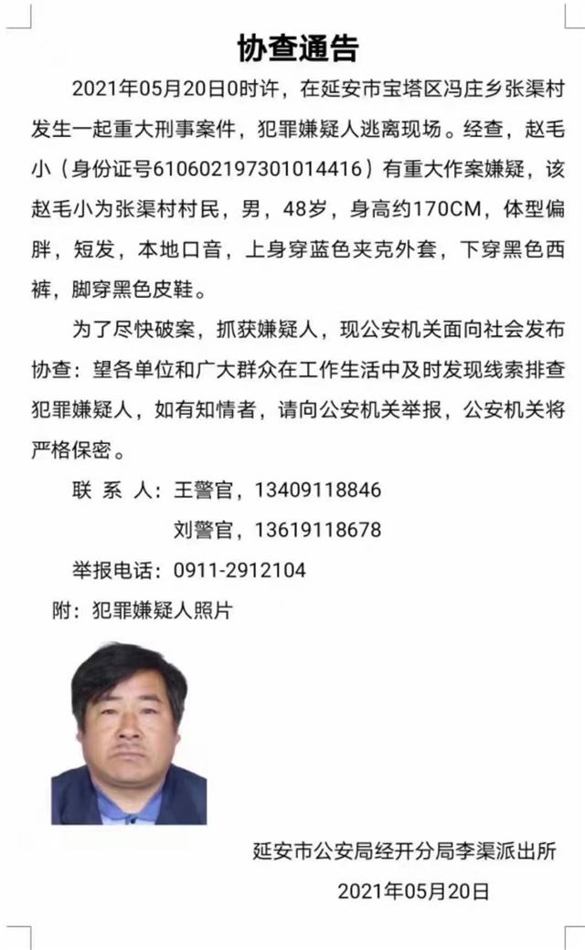 5月20日下午,延安市公安局经开分局李渠派出所发布一则《协查通告》,通告显示当日0时许,延安市宝塔区冯庄乡张渠村发生一起重大刑事案件,犯罪嫌疑人已逃离现场。经查,该村村民赵毛小有重大作案嫌疑,为尽快破案,李渠派出所向社会发布协查,如有知情者,请向公安机关举报,公安将严格保密。