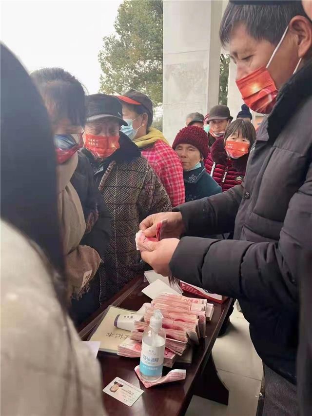 12月25日,湖北省嘉鱼县高铁岭镇石泉村村委会院子内,村里老人们戴着口罩,兴高采烈地相继来到这里排队,每人从工作人员手里领取1000元慰问金。这是高铁岭镇石泉村在外创业老板包想阶回村给老人们发放的一笔福利。
